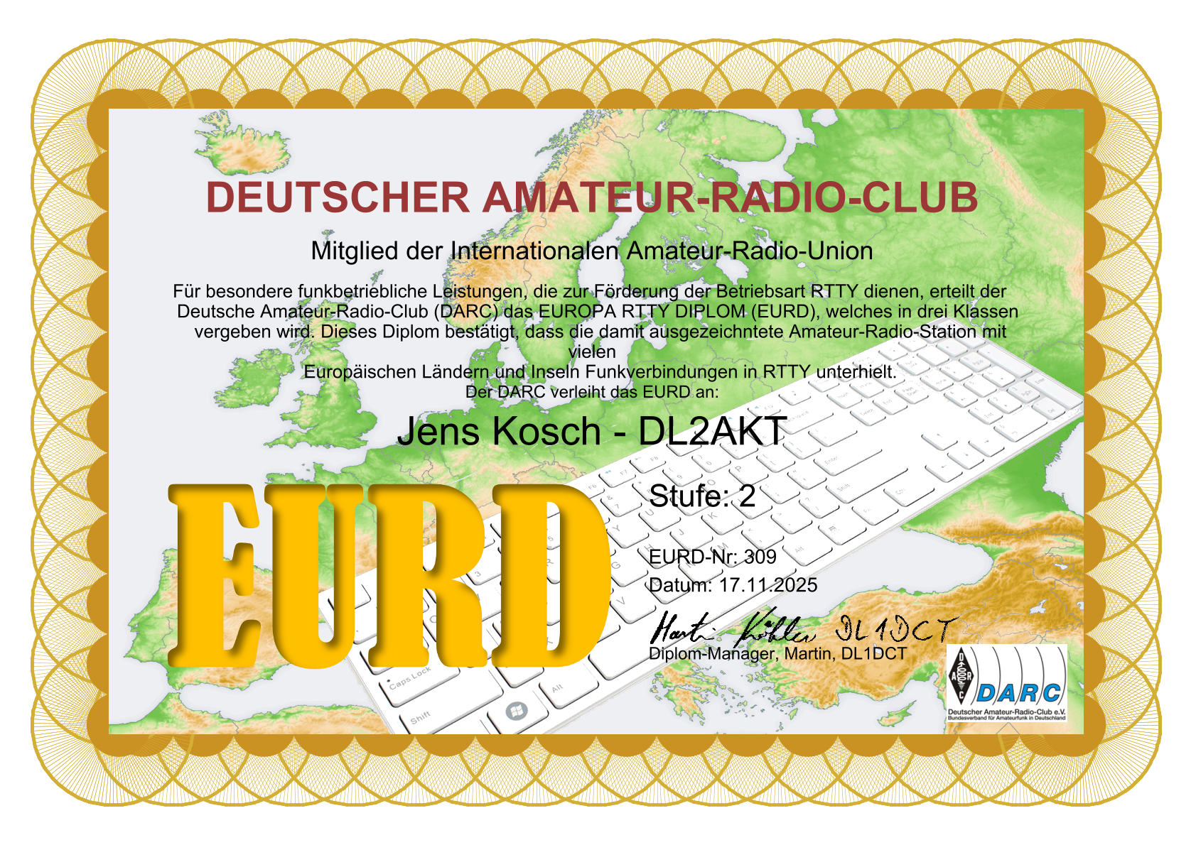 One of the most exciting modes at the beginning of my amateur radio interest was radio tele typing, also called RTTY. In the 70th’s and early 80th’s it was done using mechanical tele typers, everything printed on paper. Very noise and paper consuming. It could happen, in case of QRM, that some hundred line feeds in seconds wasted a lot of paper. Soon, my friend Harti DL6AUI and I worked on replacement of the mechanical teletyper by electronics. You may find the published article in FUNKAMATEUR journal, issue 5/1983. However, in the past 40 years I have not done any RTTY anymore. Now retired, I have more time for my hobby and remembered RTTY. Very easy nowadays with inbuilt RTTY modes in modern transceivers, PC’s and very performant software. I participated a very few RTTY contests, resulting in enough QSO for my first RTTY award. More will come, for sure.